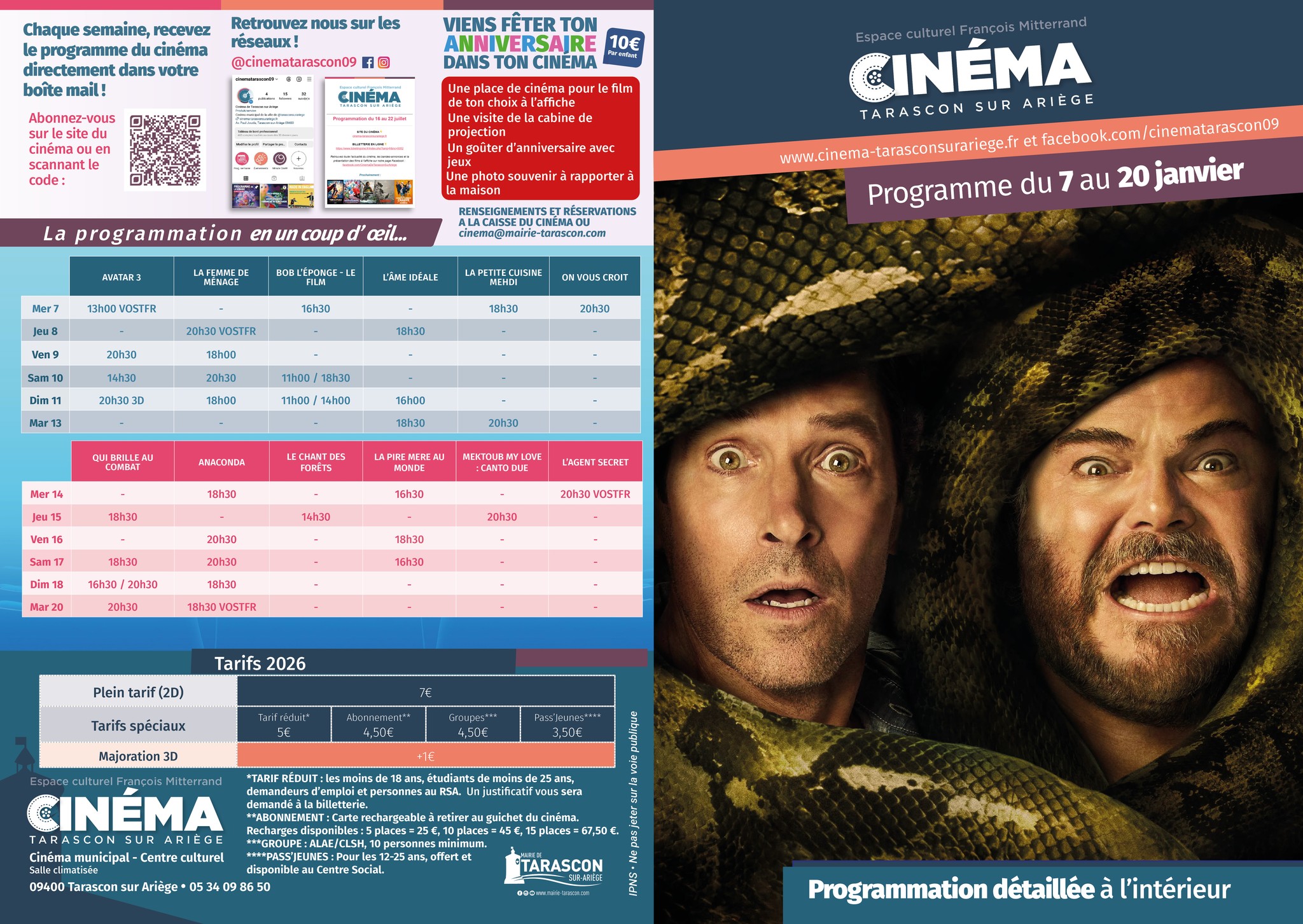 Programme à disposition dans le bâtiment ou sur le site de la mairie : https://cinema-tarasconsurariege.fr/