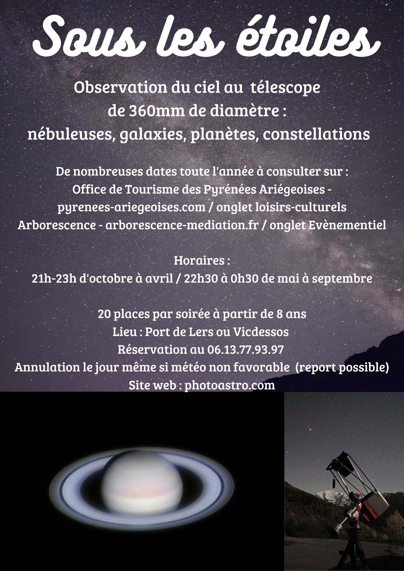 Venez profiter d'un télescope particulièrement lumineux, découvrez les nébuleuses, les galaxies mais également les planètes Vénus, Mars, Jupiter et Saturne.