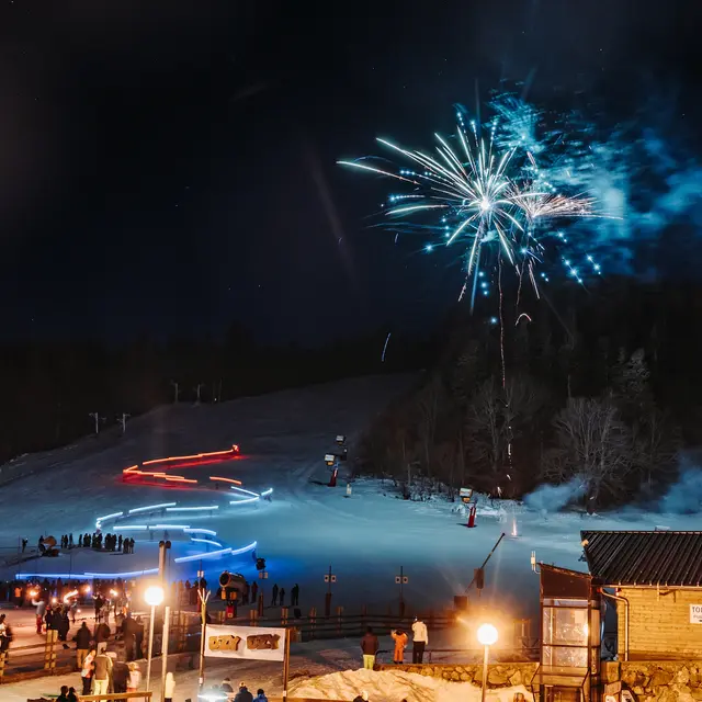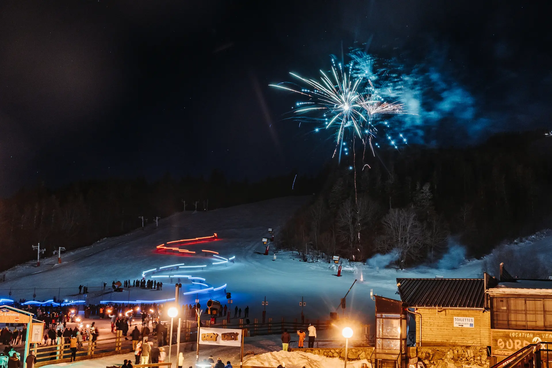 Descente aux flambeaux , feu d'artifice avec chocolat chaud et vin chaud...