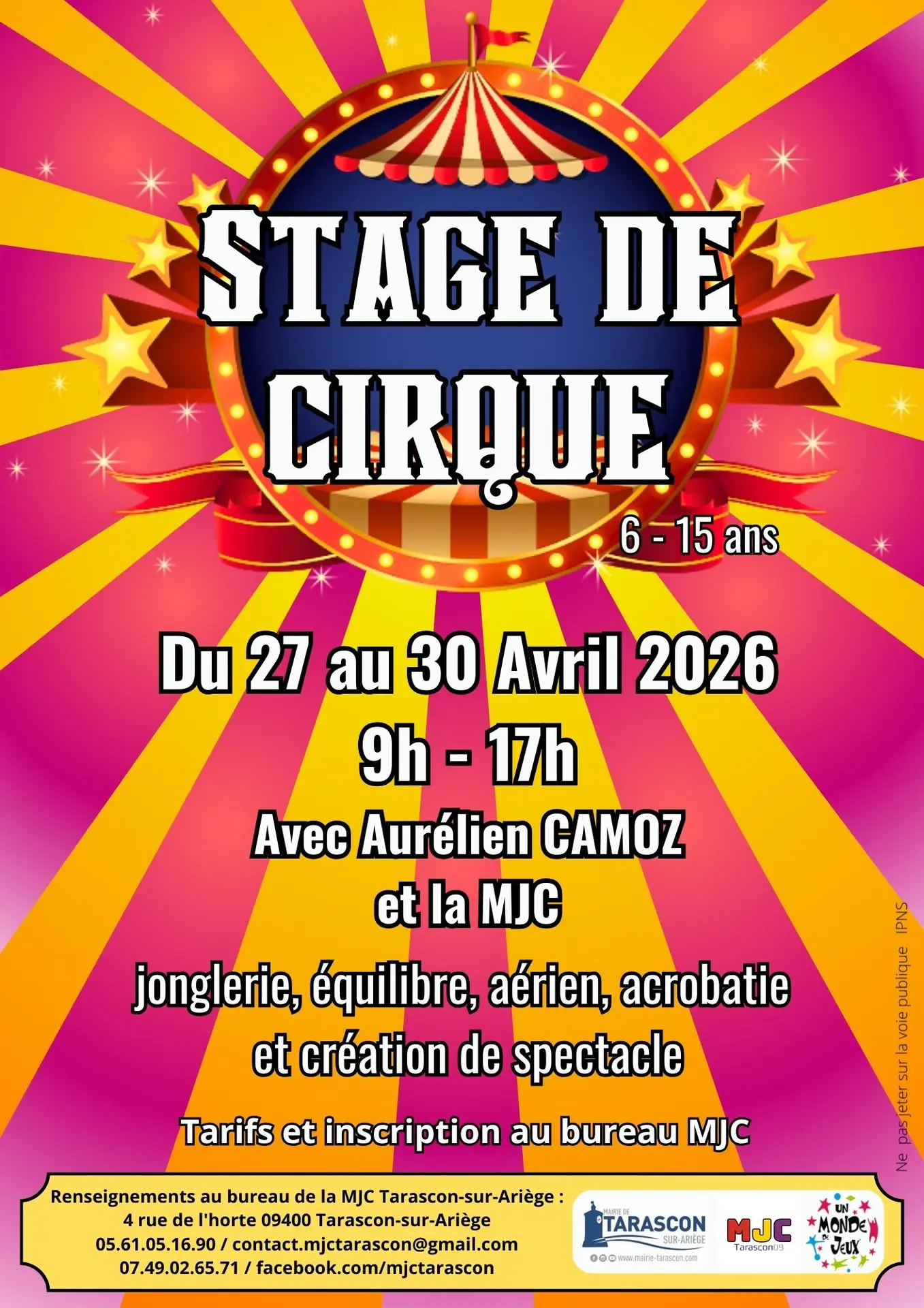 Stage de cirque avec Aurélien Camoz et la MJC. Jonglerie, équilibre, aérien, acrobatie et création de spectacle...