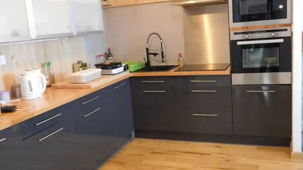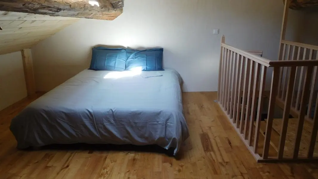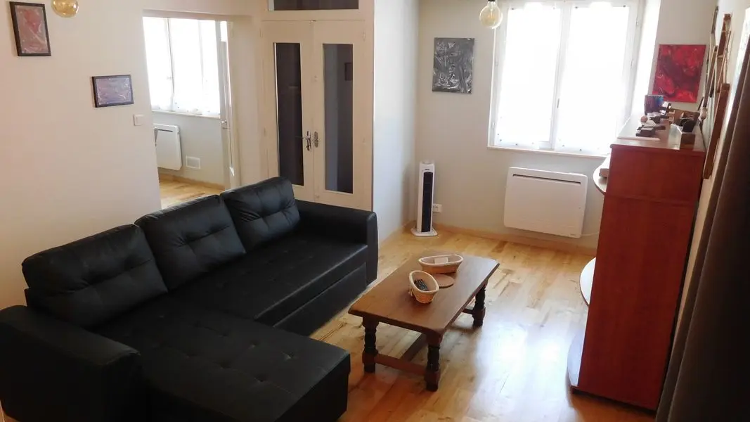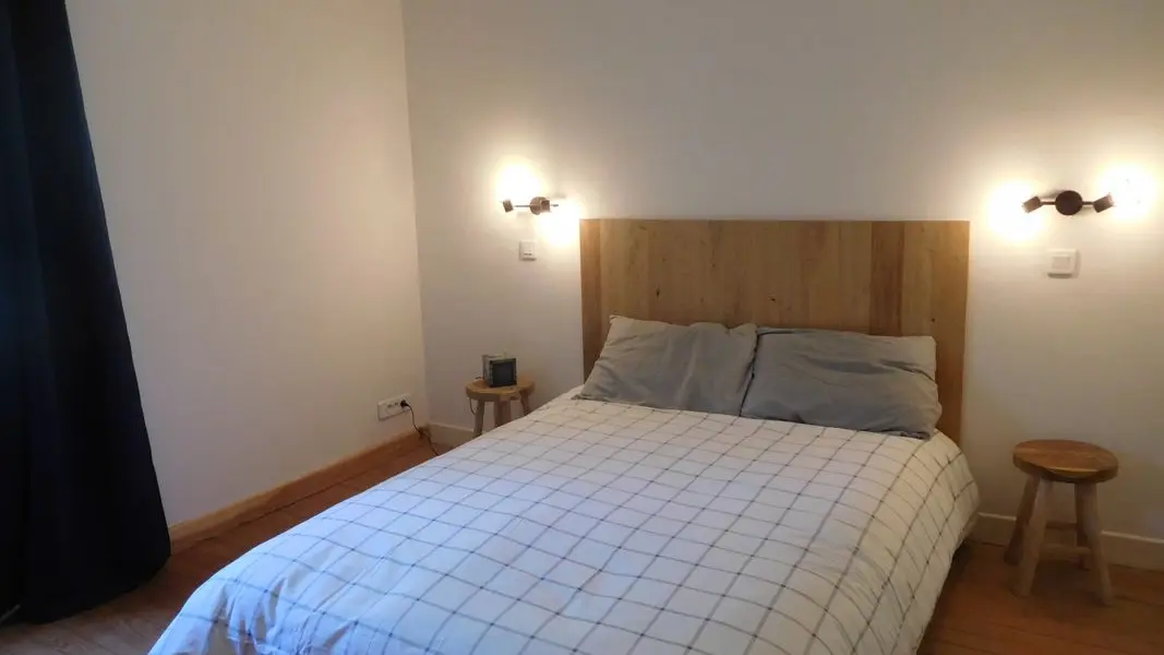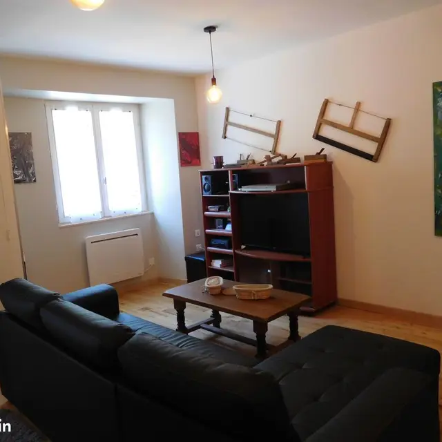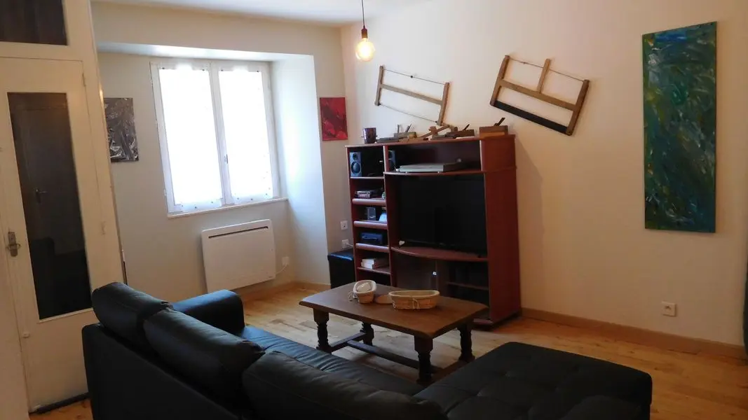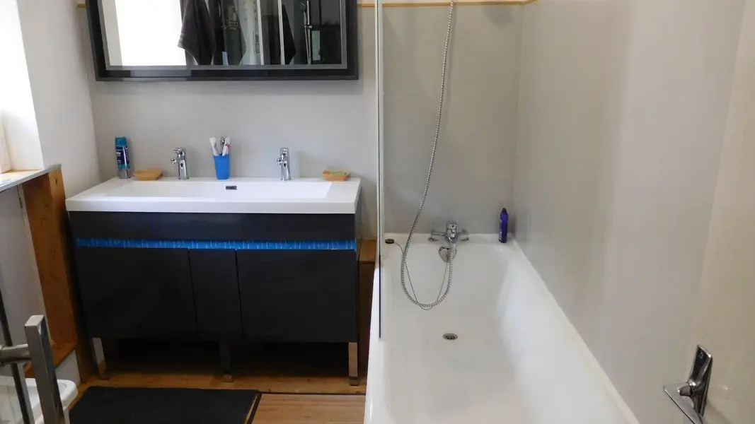 Séjour avec télévision. Coin cuisine équipée. à l'étage 3 chambres. Salle de bain avec baignoire et douche. Jardin